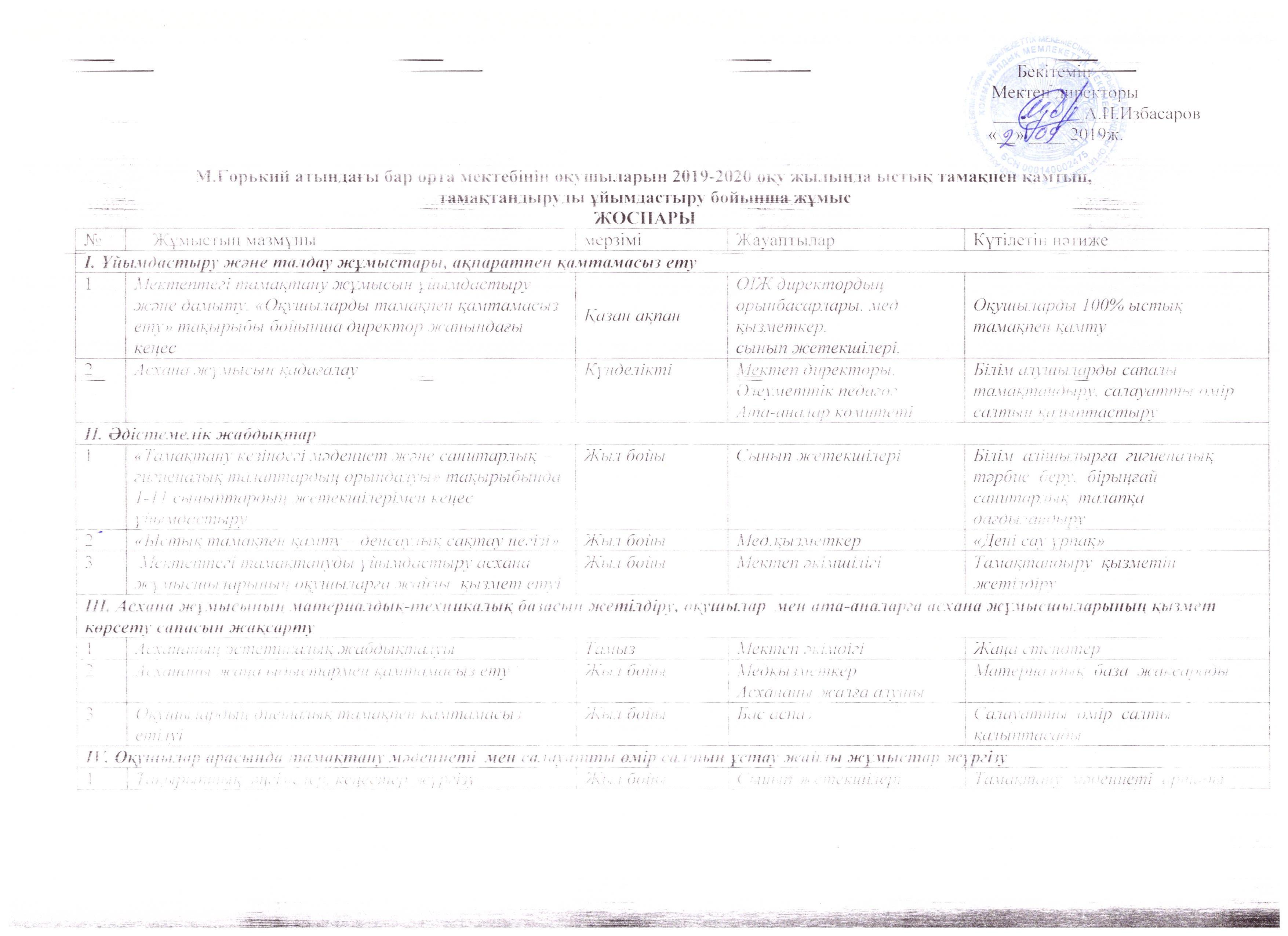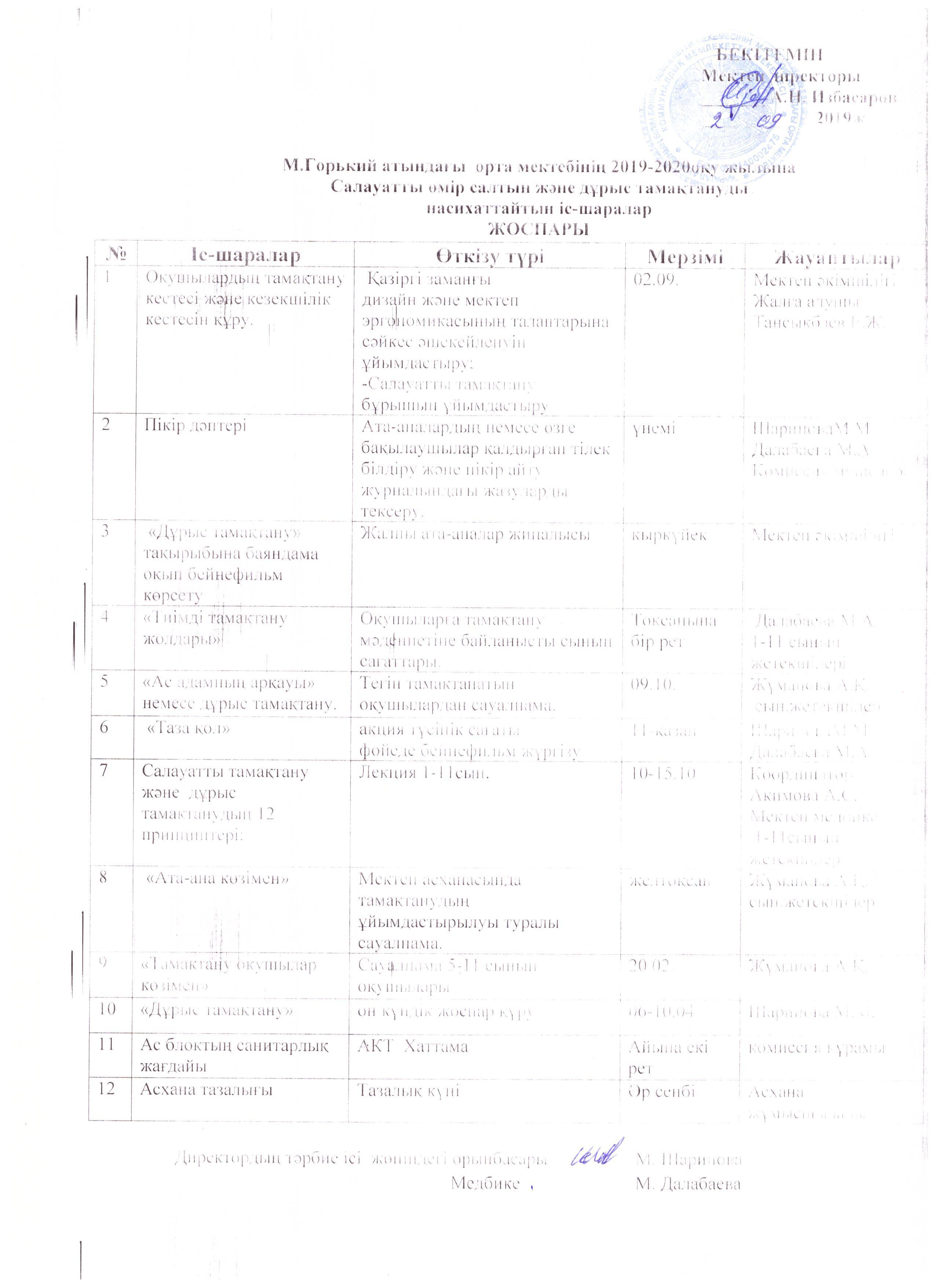 Тамақтандыруды ұйымдастыру бойынша жұмыс жоспары » М.Горкий атындағы орта мектеп